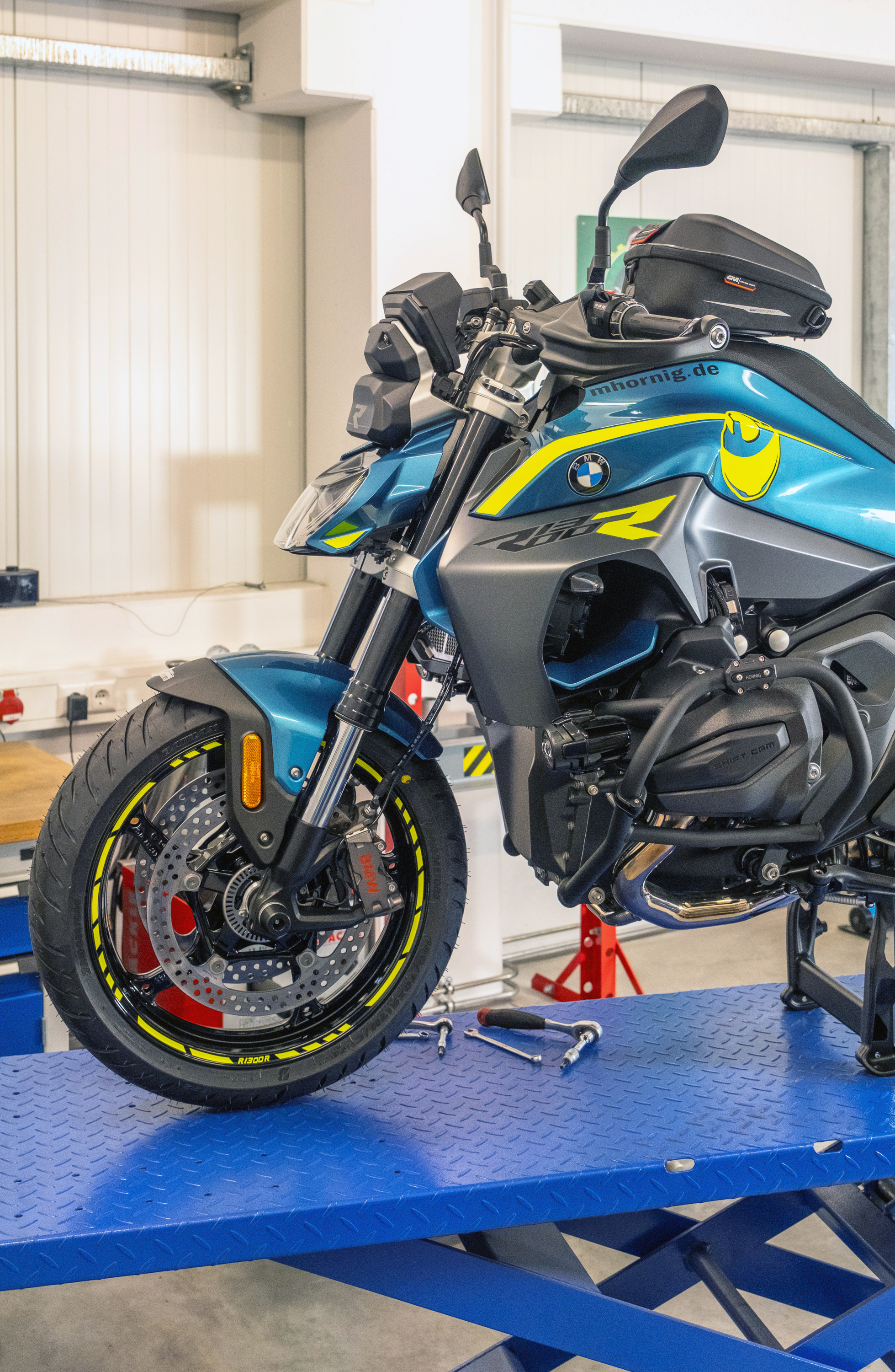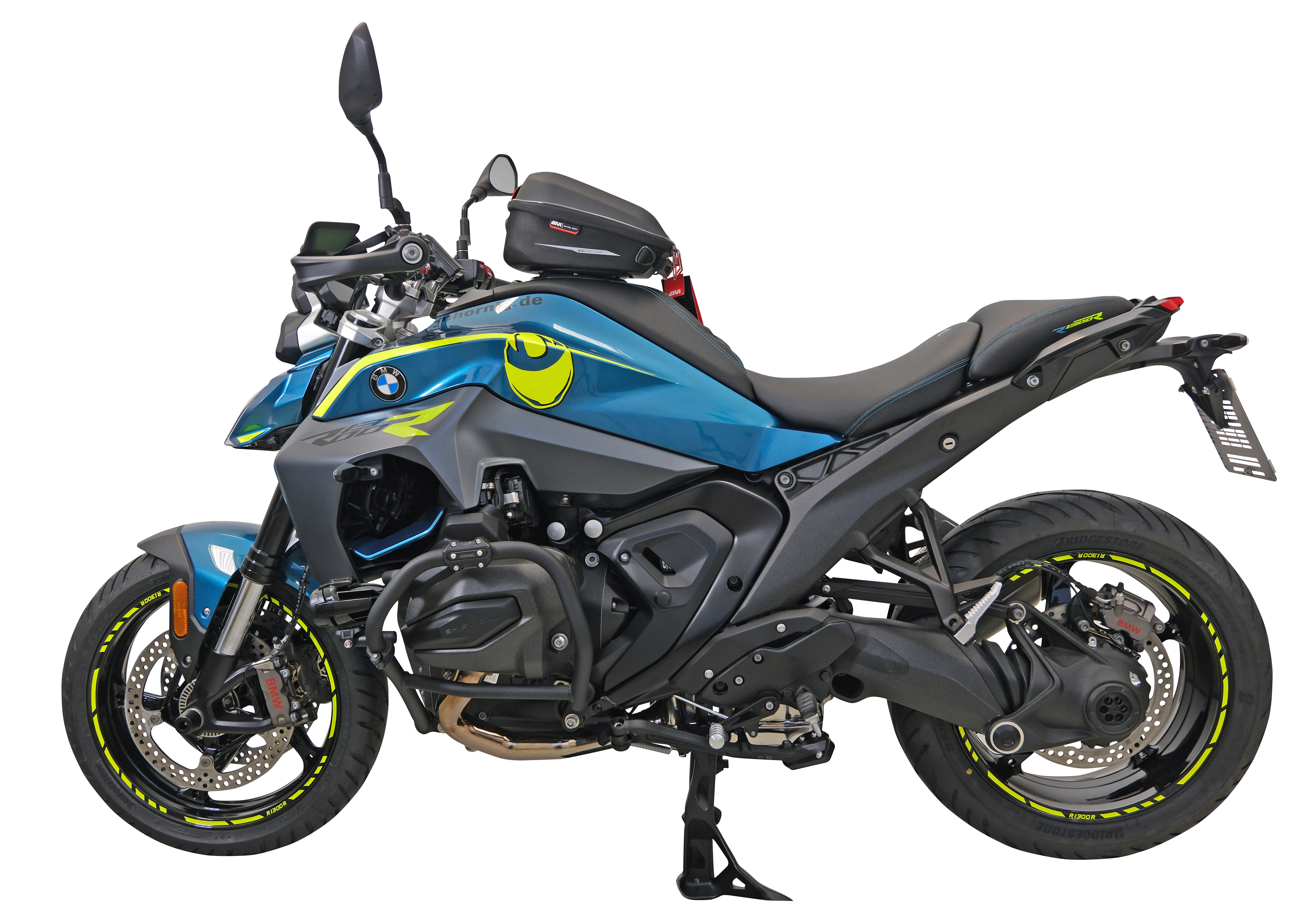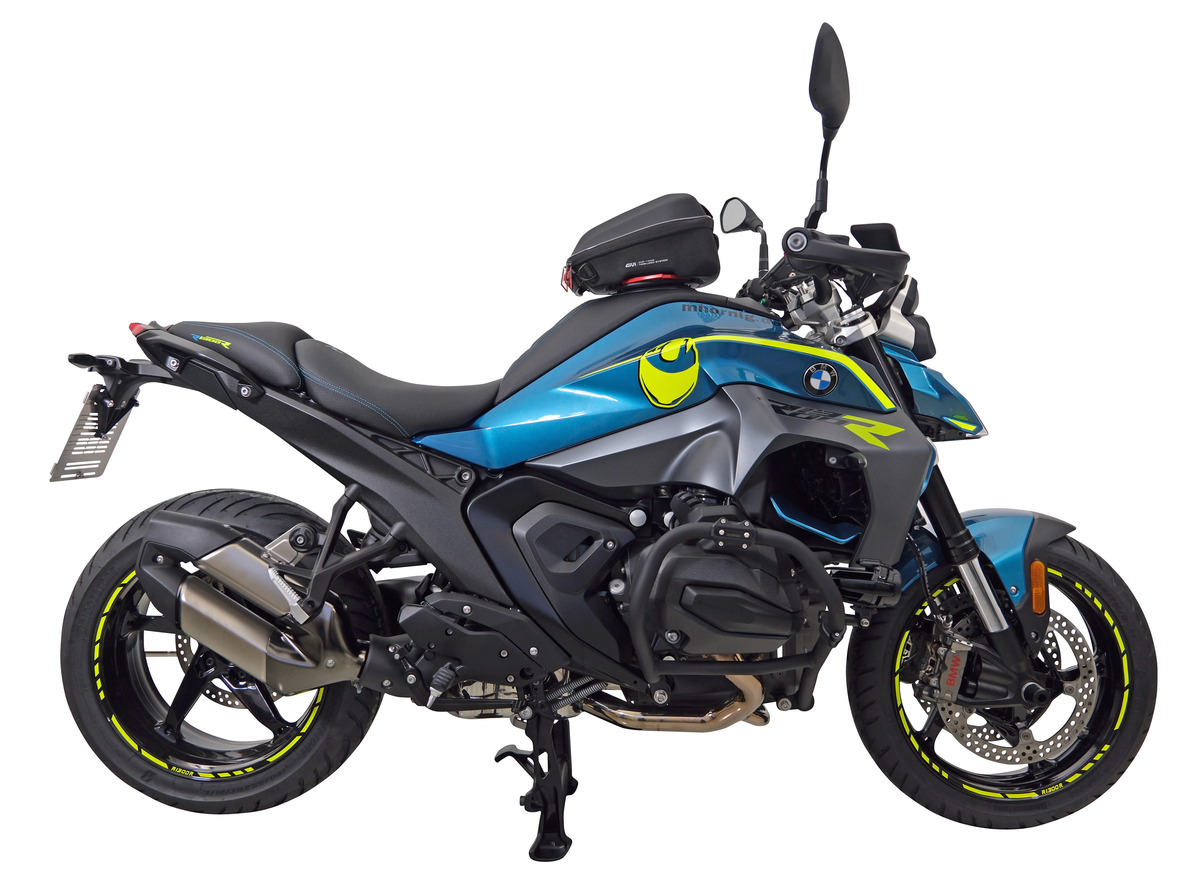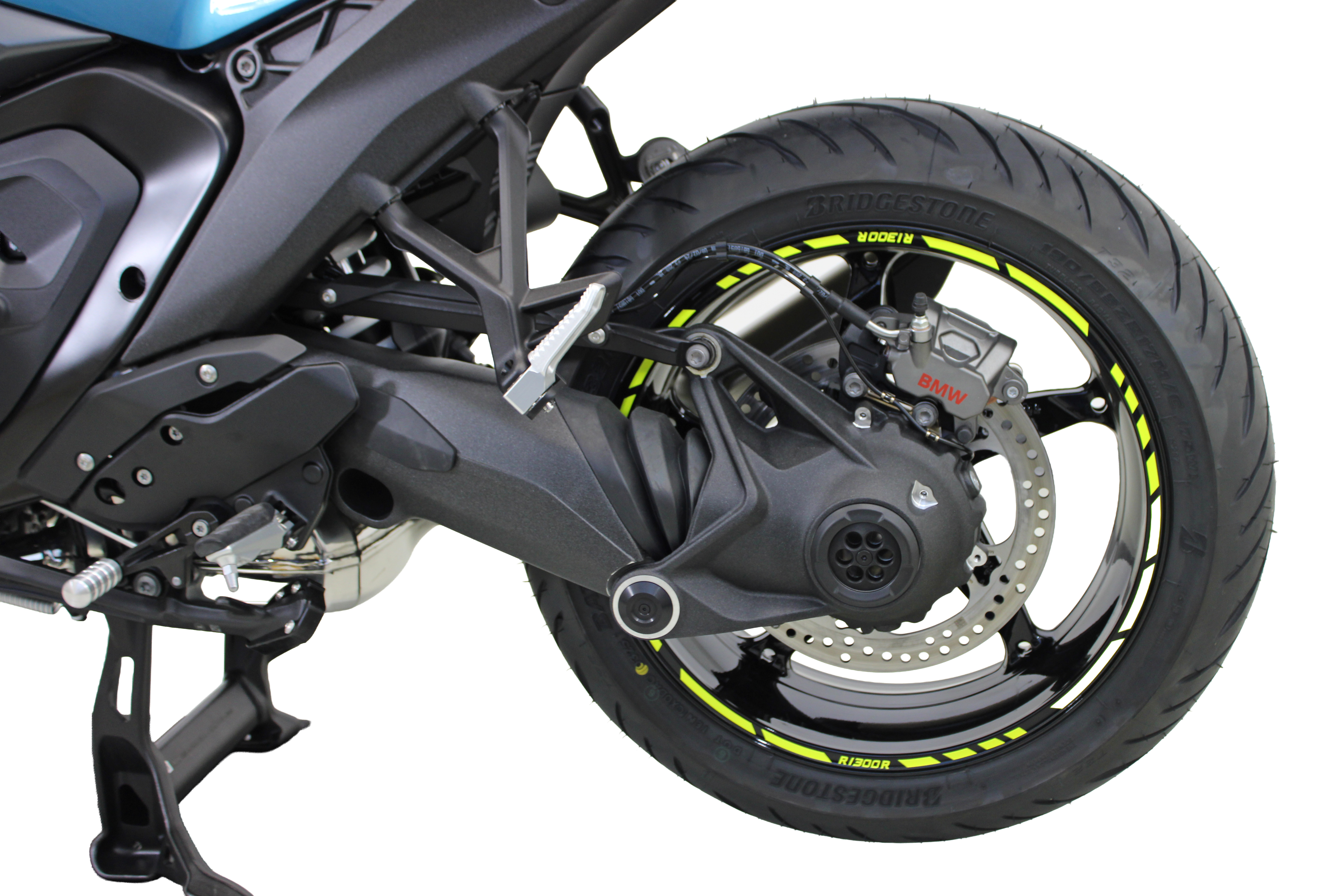 The neon yellow rim stickers with the R1300R motorcycle model designation also ensure a striking appearance. This is complemented by the decorative sticker set, which was specially designed for both sides of the vehicle and emphasizes the lines of the motorcycle.