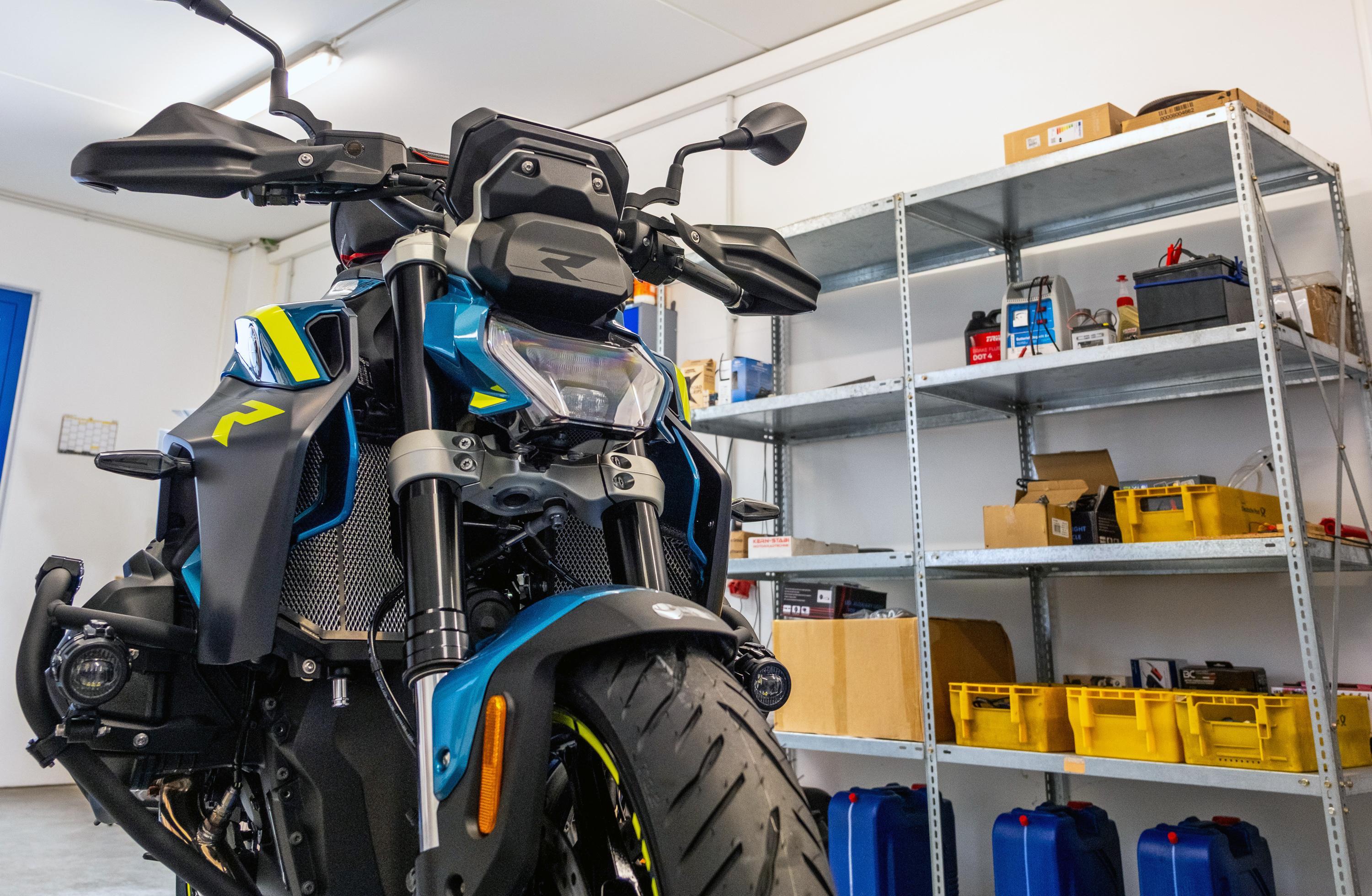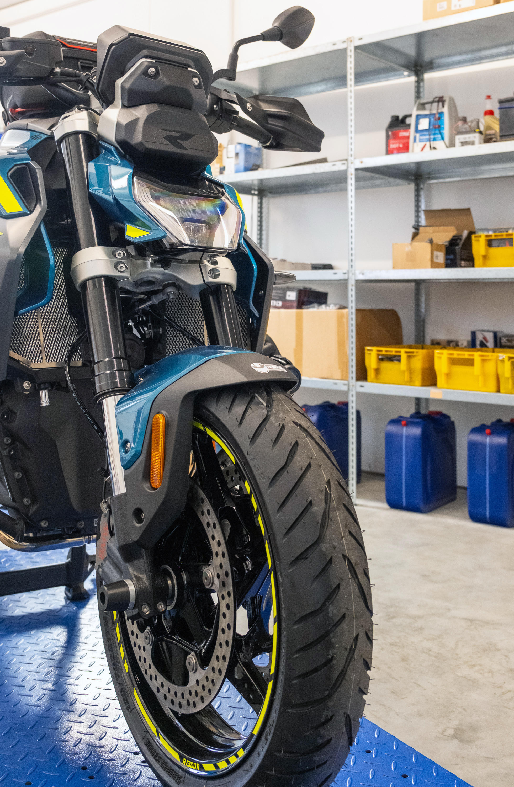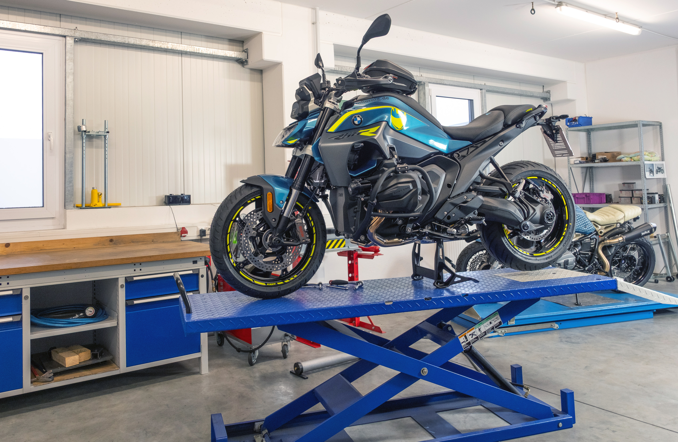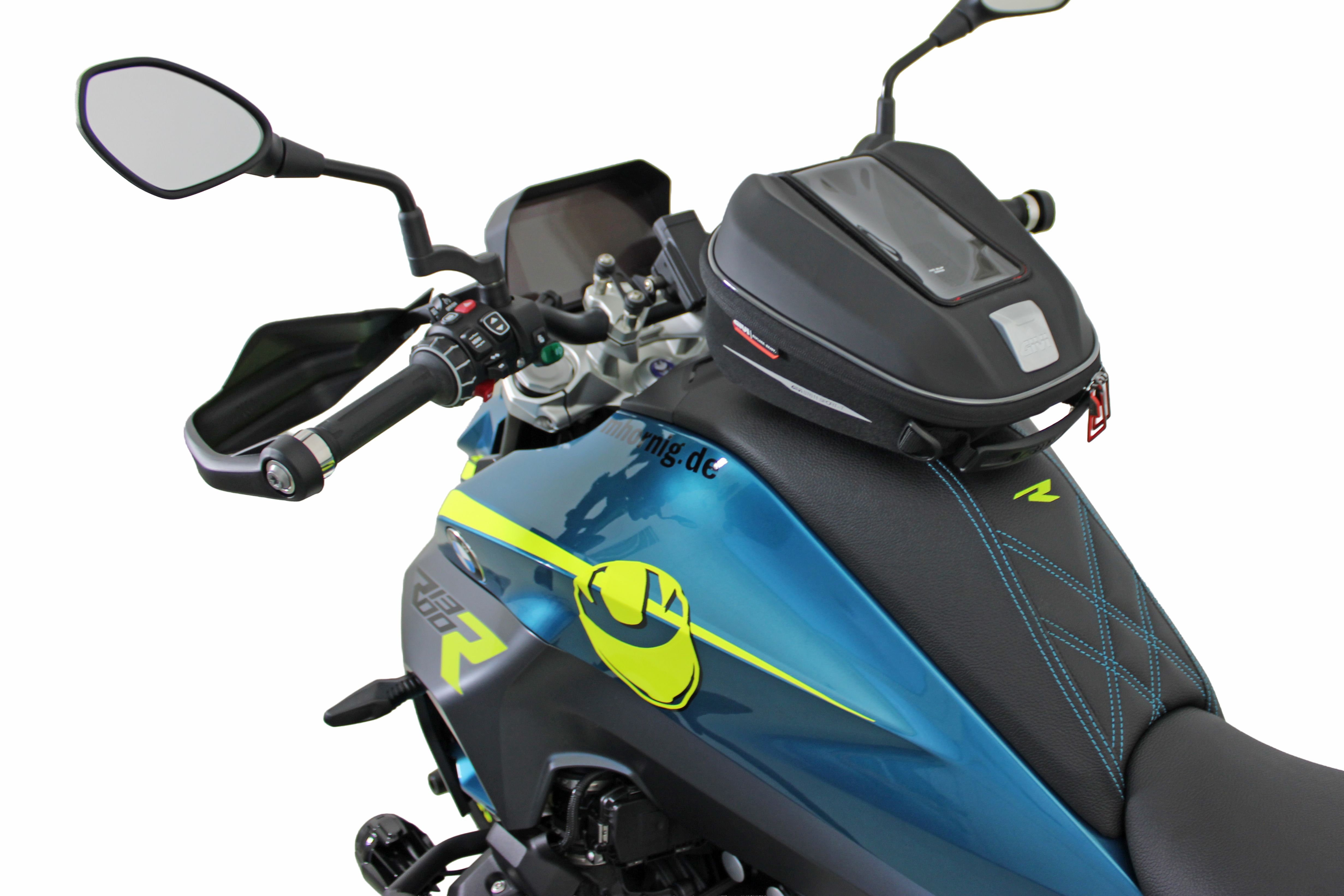 The neon yellow rim stickers with the R1300R motorcycle model designation also ensure a striking appearance. This is complemented by the decorative sticker set, which was specially designed for both sides of the vehicle and emphasizes the lines of the motorcycle.