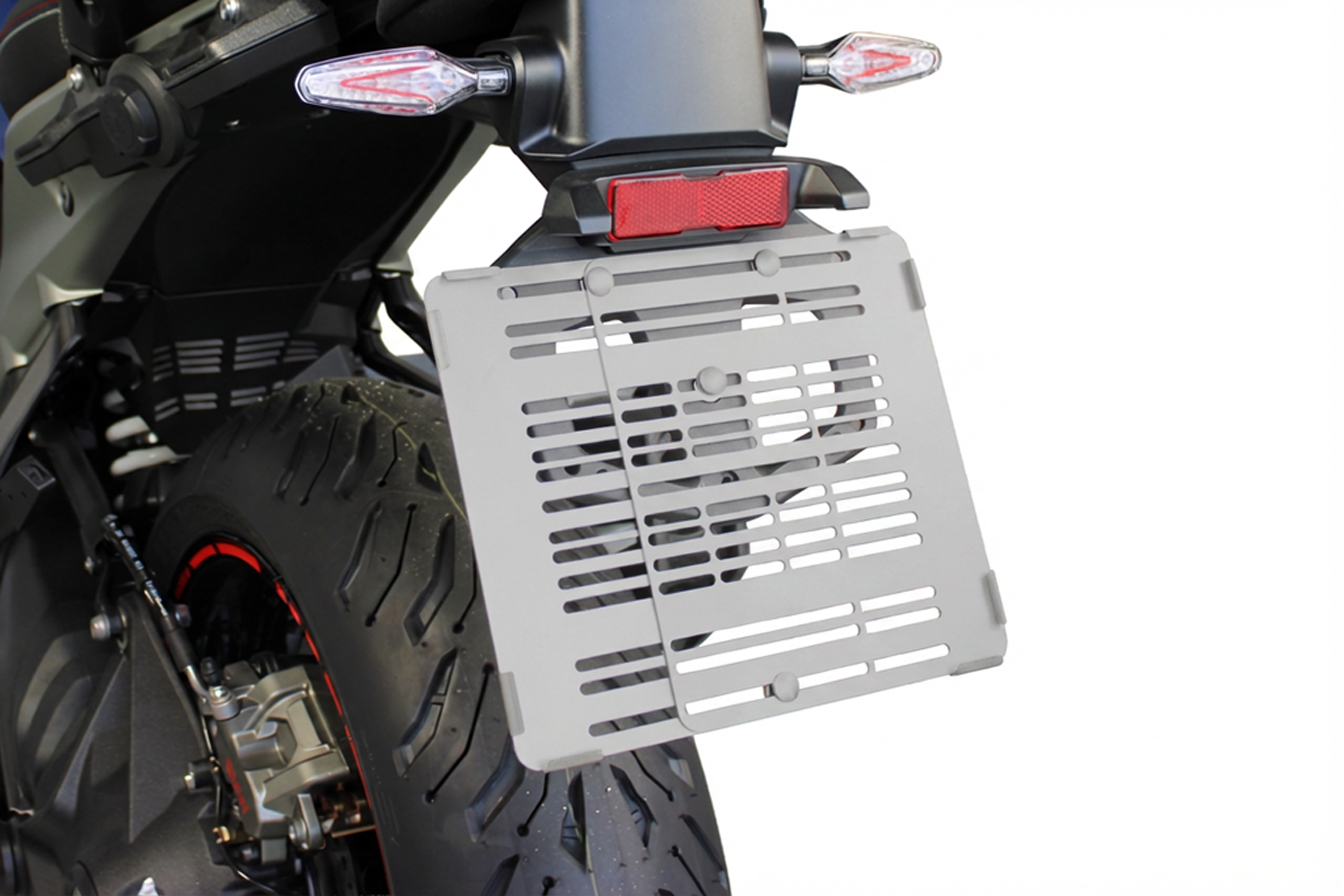 For a clear line in the rear area, the variable license plate holder is used, which can be flexibly adjusted. The covers for the open tubes of the engine mount ensure that previously open areas are also harmoniously integrated.
